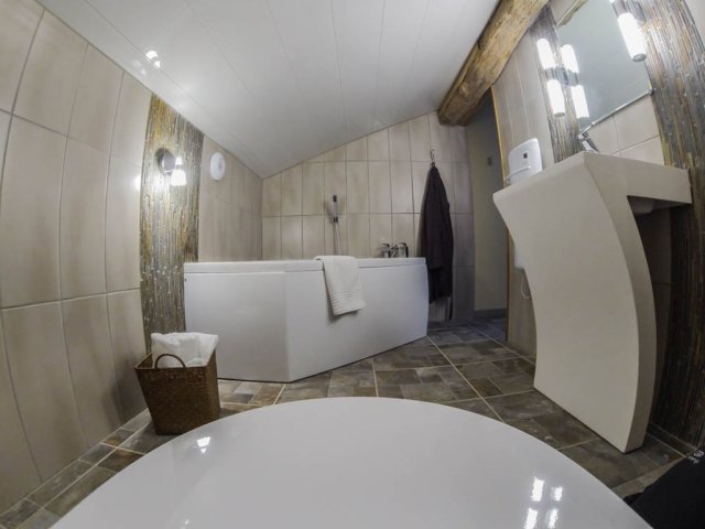 Sa salle de bain avec baignoire vous plongera dans un univers romantique et apaisant.